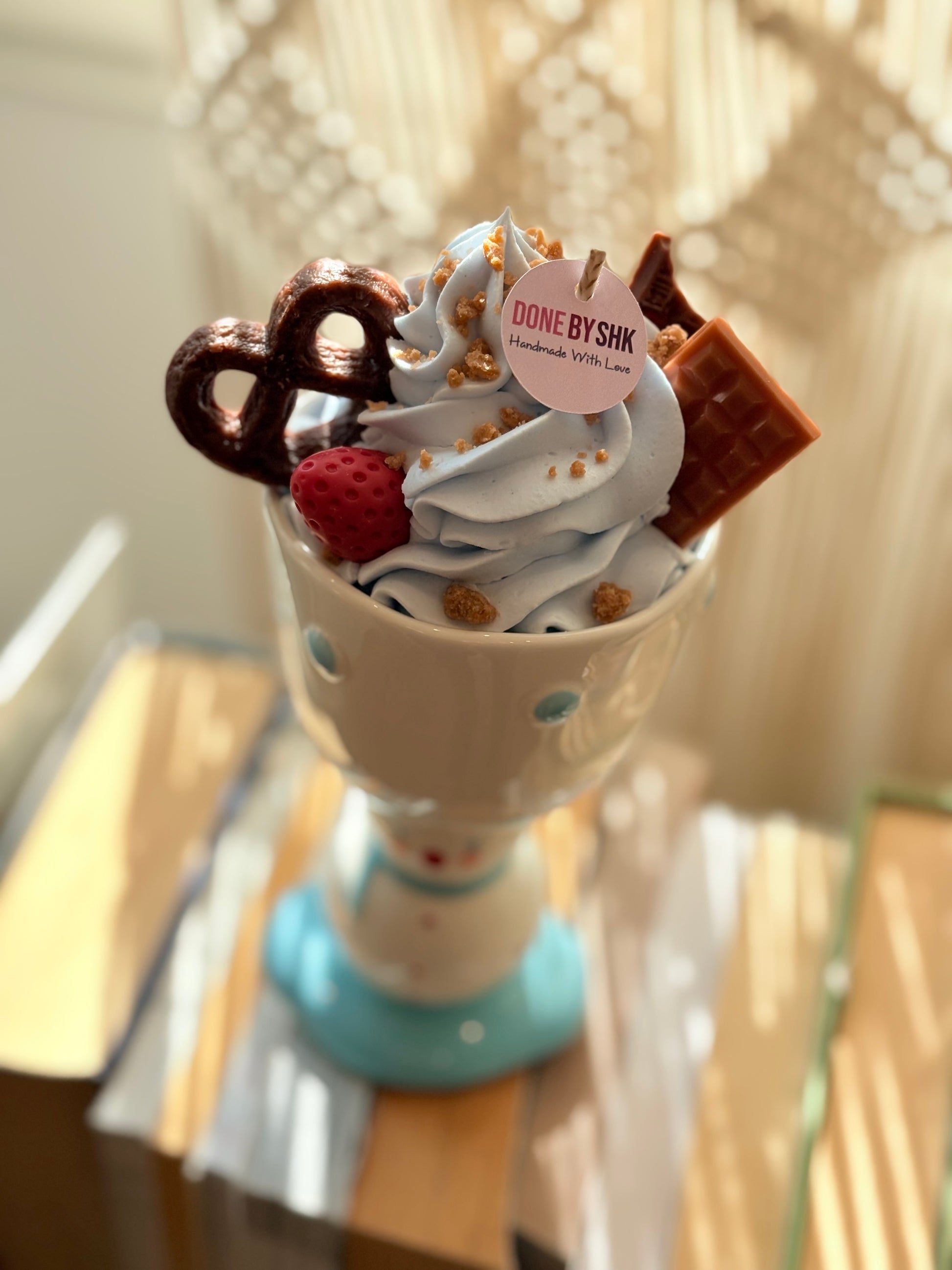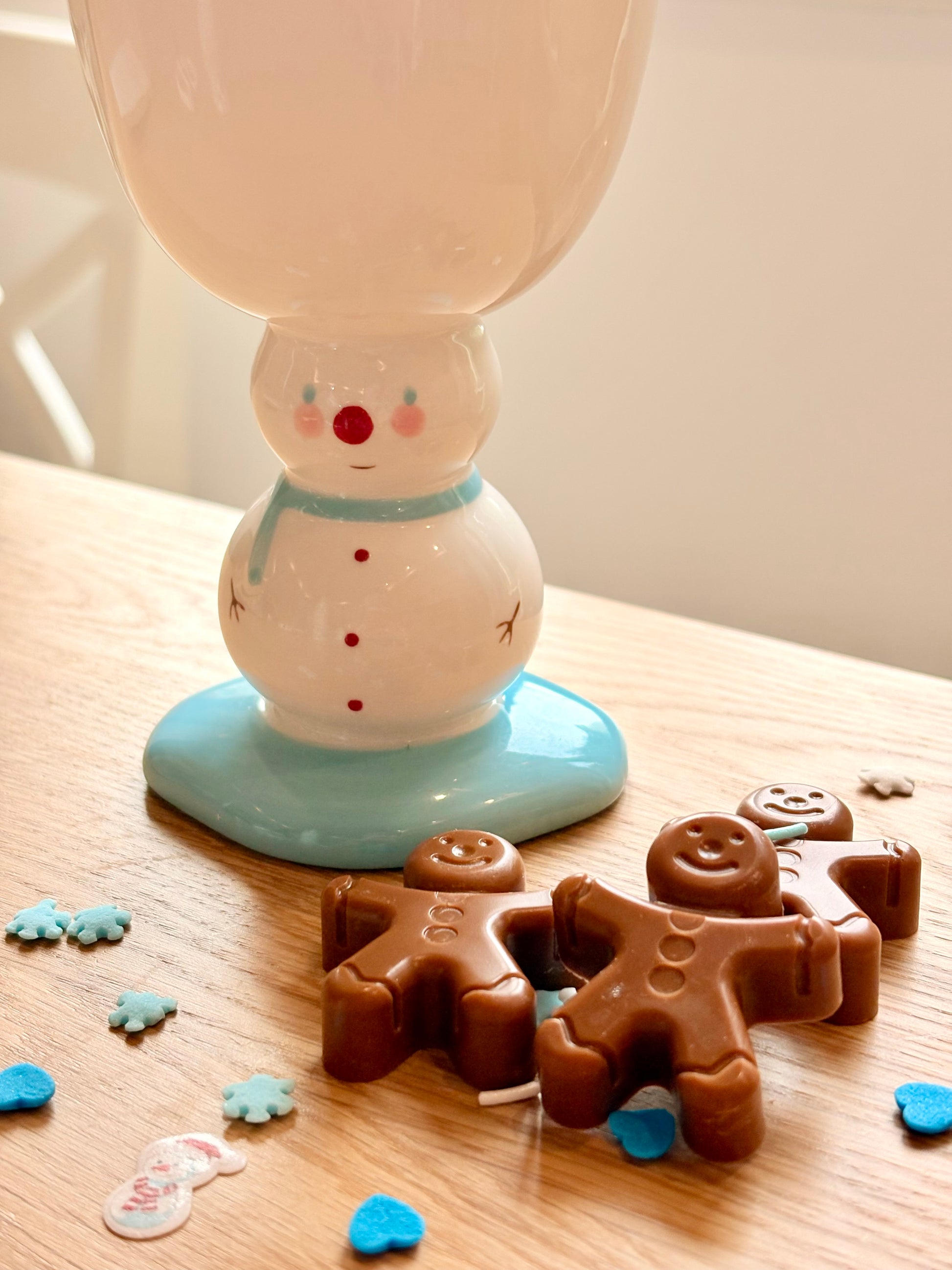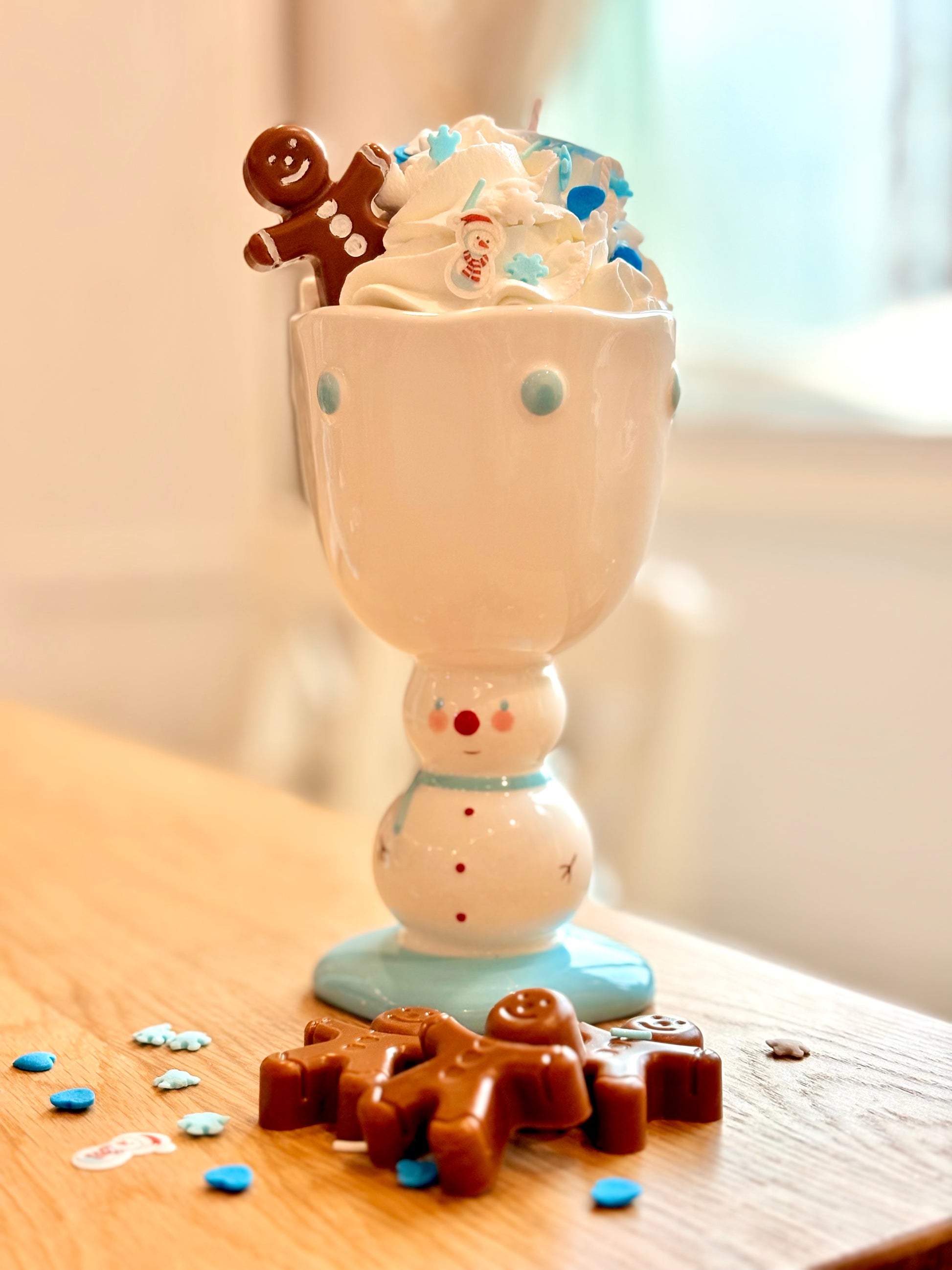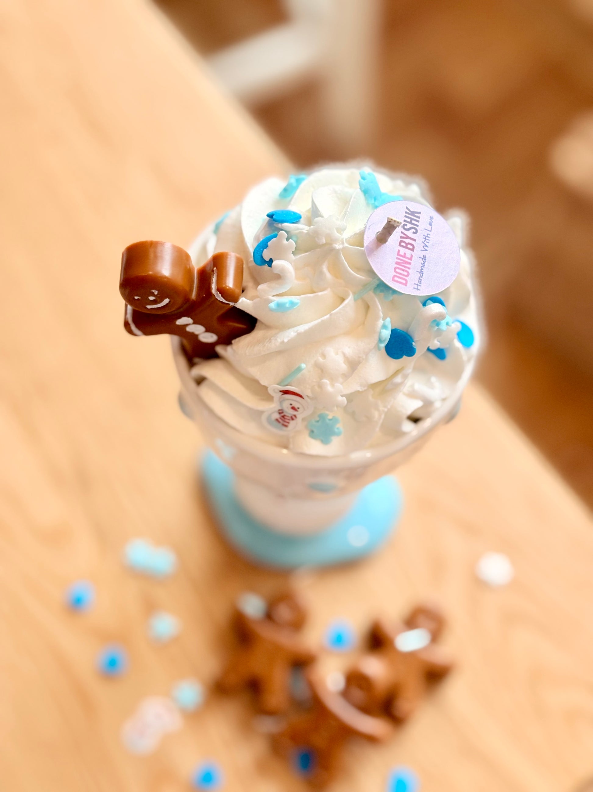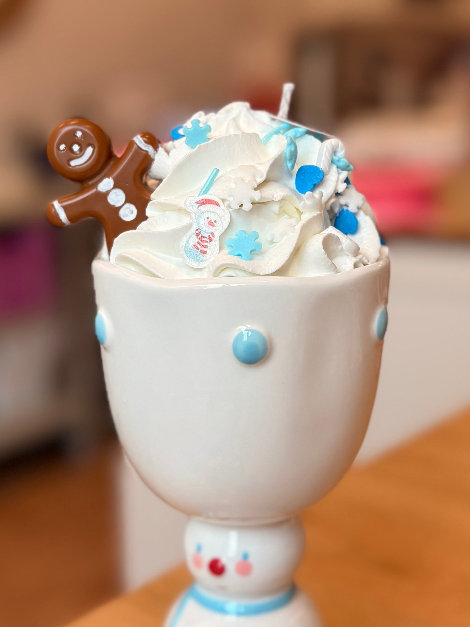 كوب سنو مان فيه شمعه كريميه مخفوقه ومزينة بكوكيز الزنجبيل وسبرنكلز الثلج ☃️❄️