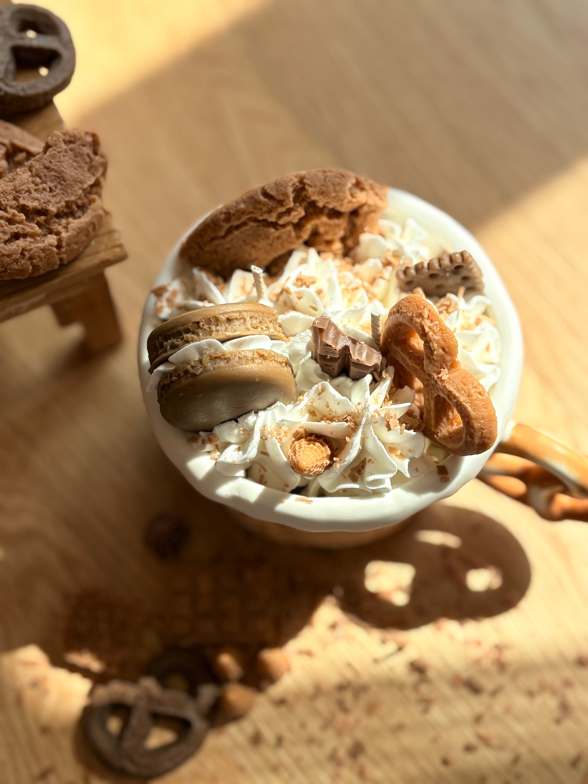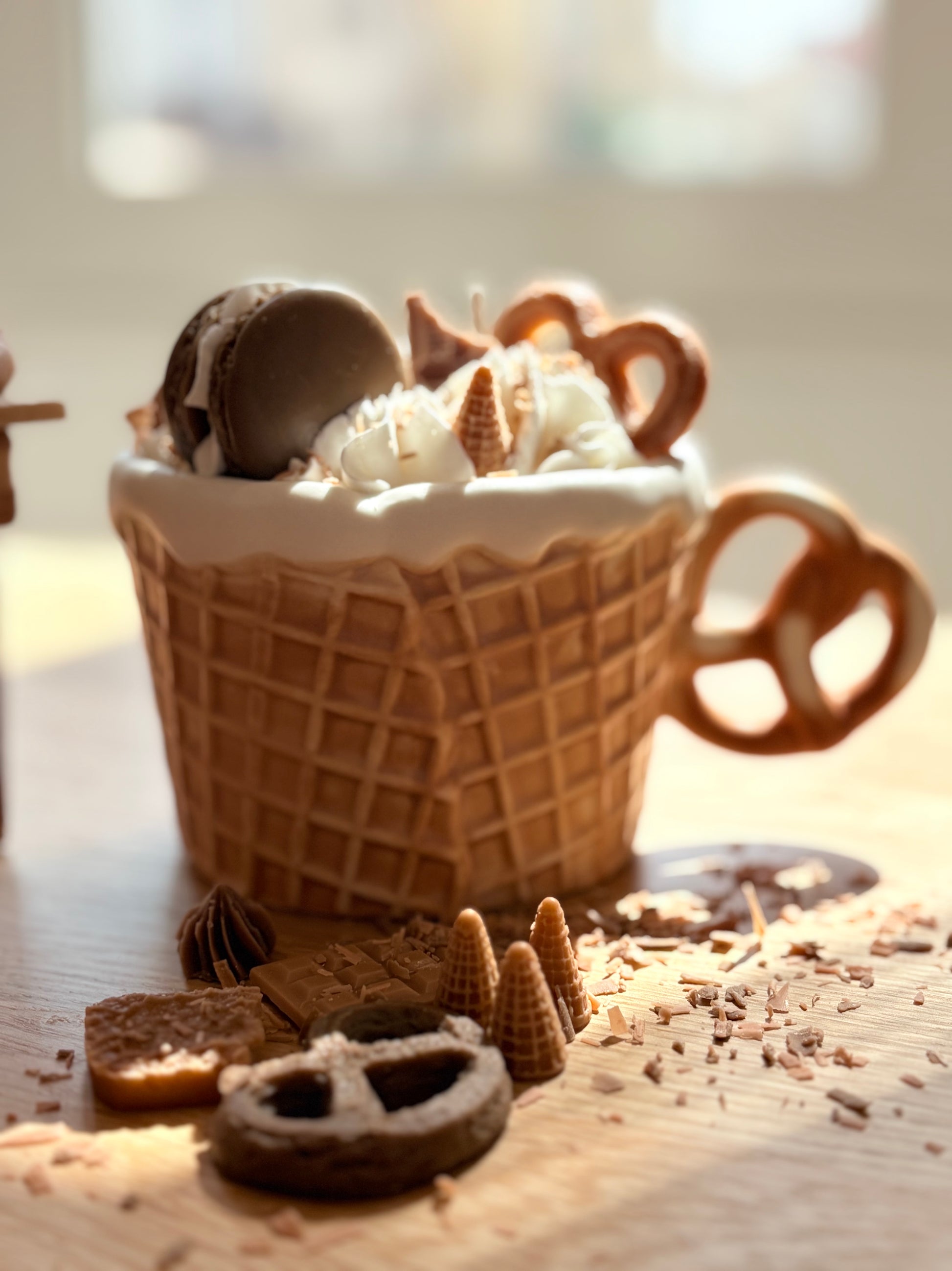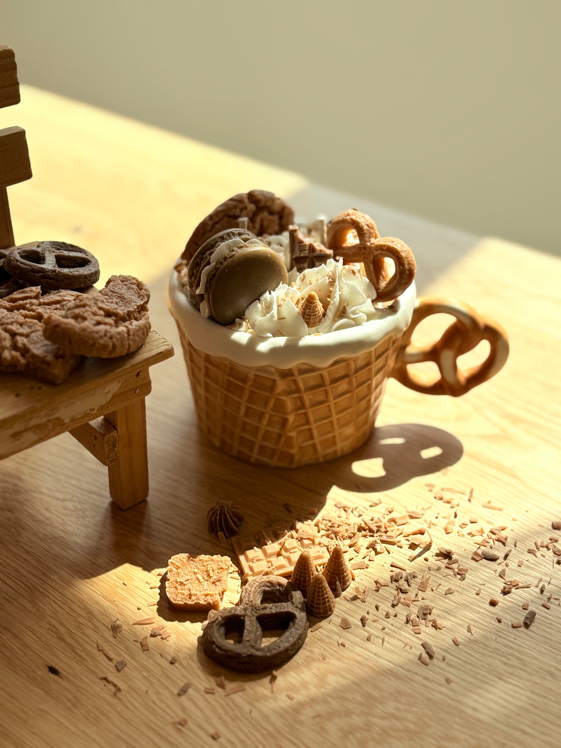 Shaped like a waffle cup and topped with biscuits, macarons, and chocolate details, this candle looks just like a gourmet dessert on a cozy coffee table.